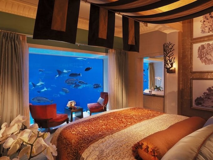 Phòng suite nằm dưới nước ở khách sạn Atlantis the Palm là phòng hạng sang bậc nhất Dubai. Trong phòng có những khung cửa sổ kính trong suốt từ sàn lên trần cho phép khách ngắm nhìn hơn 65.000 sinh vật biển trong thủy cung của khách sạn ngay từ giường ngủ. Các phòng suite đặt tên theo 2 vị thần biển Poseidon và Neptune ngoài tiện nghi hiện đại còn có dịch vụ phòng 24/24.